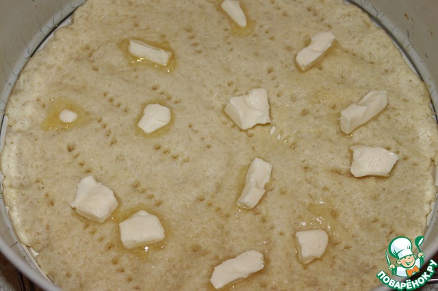 25 г сливочного масла режем на маленькие кусочки. Достаем тесто из духовки и распределяем масло по поверхности коржа.