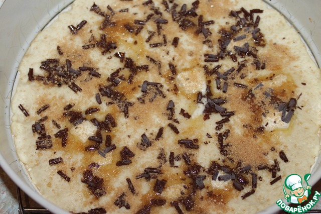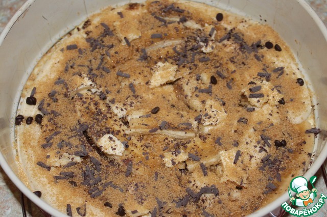 Сверху посыпаем сахаром и шоколадной стружкой, у меня была покупная, но можно и самим натереть шоколад.