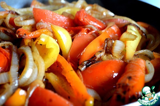 На отдельной сковороде обжариваем лук на сильном огне 2-3 мин, добавляем остальные овощи и на сильном огне, с добавлением масла, постоянно помешивая, доводим овощи до состояния "al dente", то есть овощи почти готовы, но хрустят, добавляем сахар.
