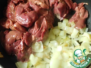 Как только лук начал золотиться, добавляем в сковороду куриную печень и немного соли.