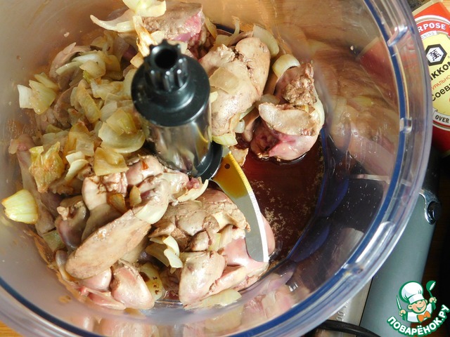 Выкладываем в чашу комбайна обжаренные лук и печень.