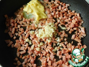 За минуту до того, как снять ветчину с огня, добавляем мелко-нарезанный чеснок и сливочное масло.