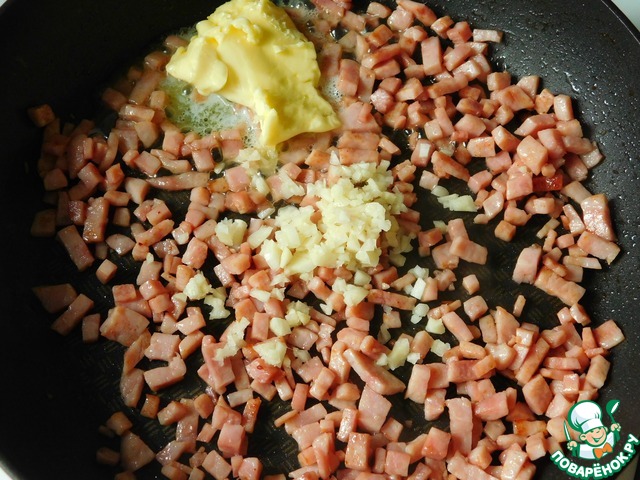 ... а также ветчину, чеснок и растопленное масло со сковороды.