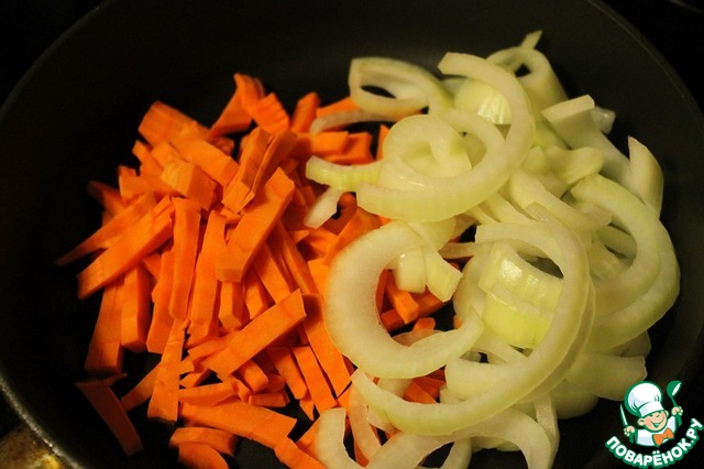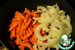 Морковь нарезать крупной соломкой, лук полукольцами.
