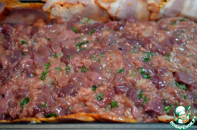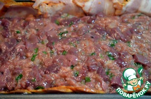 Прямоугольную форму для запекания с высокими бортиками выстлать полосками свиной грудинки так, чтобы были закрыты дно и борта, а концы полосок свешивались наружу.