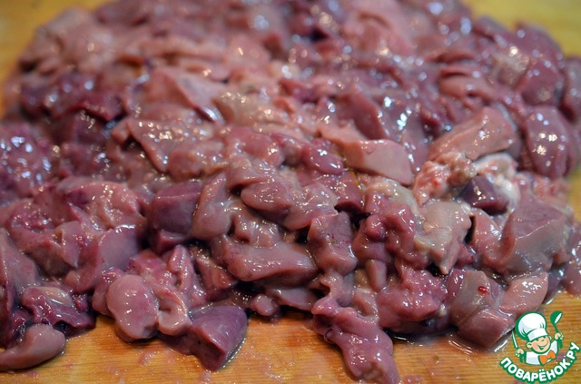 Куриную печенку вымыть, мелко порубить.