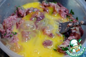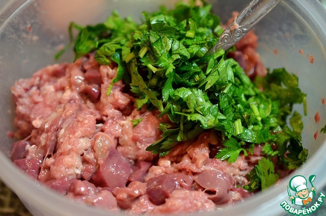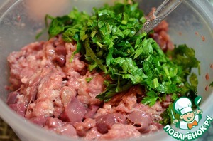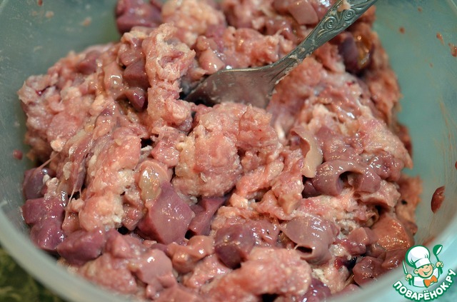 Фарш перемешать с печенью.