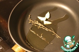 В сковороду налить масло, добавить тимьян 3 веточки и зубчик чеснока, раздавленный плоской стороной ножа.