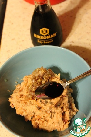 К фасолевой массе добавить обжаренный лук, тимьян сняв листочки с веточки, перец и соевый соус.