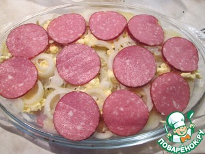Выложить на картофель половину лука ( чуть присолить ) и половину салями.