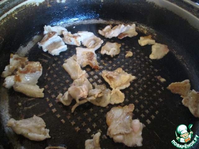 Бекон порезать на небольшие кусочки и обжарить до золотистого цвета.