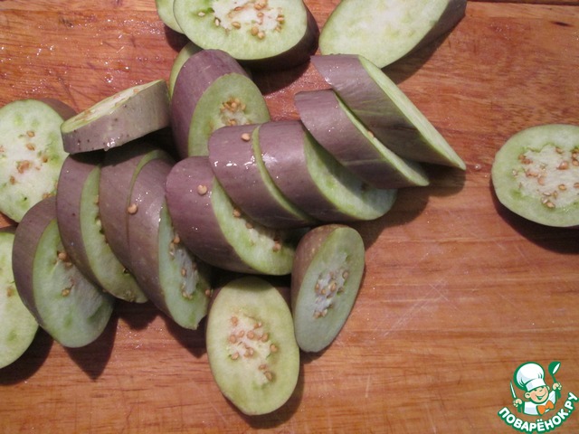 Баклажаны порезать колечками, посолить, пропарить 3-4 минуты.