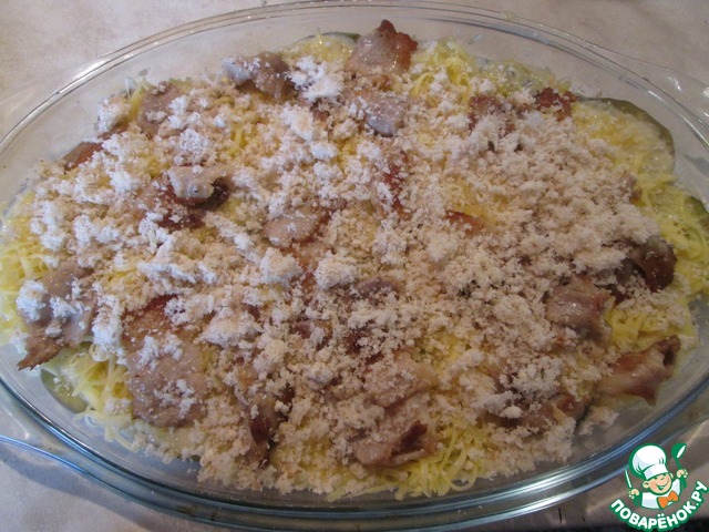 Приготовить соус бешамель. Сливочное масло растопить на сковороде, добавить муку, размешать, немного прогреть. Добавить молоко, соль, перец, мускатный орех, варить до загустения. Духовку разогреть до 200 градусов. Пропаренные баклажаны выложить в форму для запекания, залить соусом, присыпать тертым сыром. выложить кусочки бекона и посыпать хлебной крошкой.