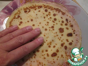 Время приготовления я указала без учета времени на приготовление блинчиков и охлаждение торта. Итак, для этого тортика понадобится 20 - 25 тонких не очень сладких блинчиков, которые можно испечь по любому рецепту. Я пеку вот по этому рецепту http://www.povarenok .ru/recipes/show/945 90/, делаю двойную порцию. Блинчики получаются прекрасные от самого первого до последнего - тоненькие, прекрасно сочетающиеся с любой начинкой. Ирочка, тебе респект!)))