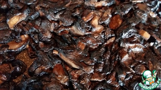 Лесные грибы /у меня уже готовые жаренные с луком/ томить на маленьком огне до полного выпаривания влаги. Грибы становятся темно-серого /почти черного/ цвета и приобретают очень насыщенный вкус и аромат.