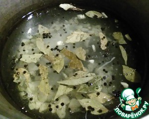 В толстостенную кастрюлю ( у меня казан), выливаем масло, уксус, добавляем нарезанный кусочками чеснок, черный перец горошком, лавровый лист, сахар и соль. Добавляем воду и отправляем казан на огонь.
