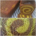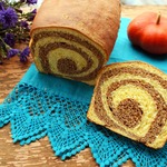 На тыквенный прямоугольник теста сложить шоколадный прямоугольник и свернуть рулетом.