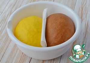 Разделить тесто на две части, в одну добавить какао, вмешать его в тесто. Накрыть миску полотенцем.