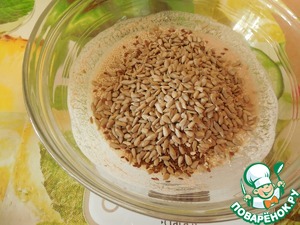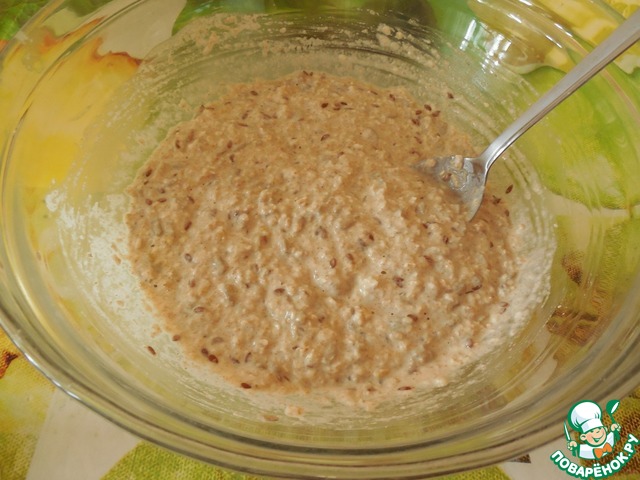 Добавить овсяные хлопья, соль, кунжут, семя льна, семя подсолнечника - перемешать.
