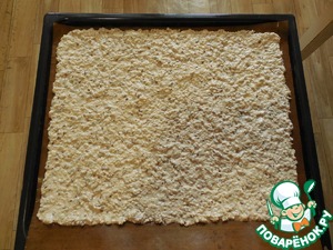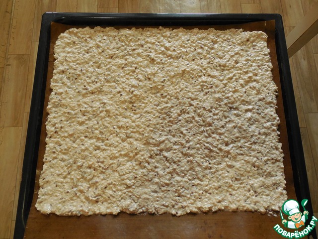 Противень застелить пергаментом или специальным прямоугольным ковриком. Тесто равномерно распределить на противне тонким слоем, затем отправить противень на 10 минут в духовку при температуре 180 градусов.