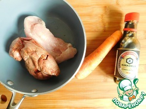 Филе и печень курицы заливаем холодной водой, доводим до кипения и варим под крышкой. Отдельно ставим варить морковь. Когда морковь сварится до готовности, чистим и натираем её на мелкой тёрке.