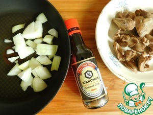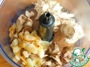Перекладываем в чашу комбайна сваренные до готовности филе и печень курицы, добавляем жареный лук, чёрный молотый перец и соевый соус. Измельчаем до гладкой и однородной массы, пробуем и, если необходимо, приправляем солью.