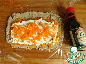 На доске расстилаем пищевую плёнку, выкладываем мясную смесь, придавая ей форму прямоугольника. Сверху выкладываем натёртую морковь, делая небольшой отступ с дальнего широкого края прямоугольника. Морковный слой немного солим.