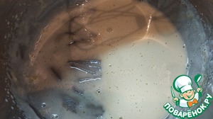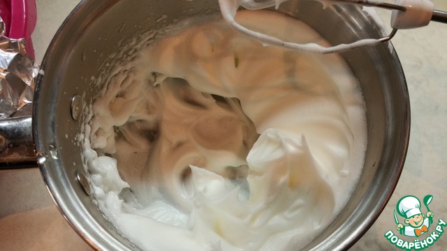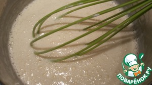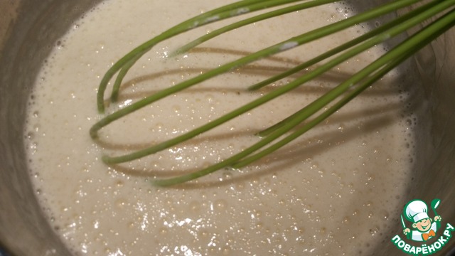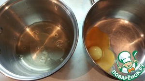 Тонкой струйкой вливаем в желтки, продолжая взбивать