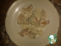 Отваренные кальмары тушим со сметаной до загустения, добавляем специи, зелень и соль |
