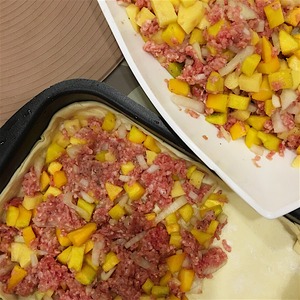 В овощи добавить размороженный фарш ( я размариживала при комнатной температуре), посолить, поперчить и все тщательно перемешать. На тесто кладём начинку ровным слоем и закрываем вторым слоем теста