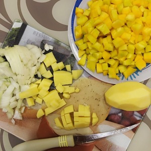Лук очистить и нарезать мелко, картофель очистить и нарезать маленькими кубиками, тыкву также очистить, убрать семена и нарезать небольшими кубиками