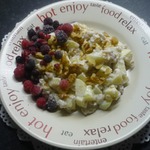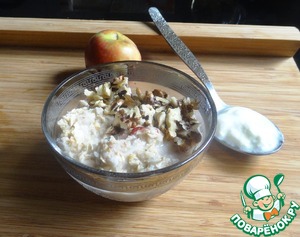 • В запаренные хлопья добавить тёртое яблоко, орехи и йогурт.
