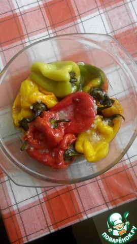 Оставшийся "соус" ( а он обычно остается) вместе с чесноком выливаем на перцы.