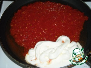 На сковороде поджарить томатную пасту со сметаной (я на зиму делаю свою томат-пасту: пропускаю помидоры на мясорубке, кипячу около часа и горячим заливаю в банки).