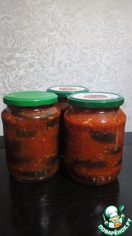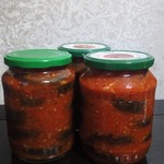 Из 1/2 нормы всех ингредиентов , за исключением баклажан (их ушло как на целую норму) у меня получилось 3 баночки по0.7л, и 2 баночки 0.5л, плюс 0.28 баночка вкусного соуса, который прекрасно подходит к макаронами вместо кетчупа.