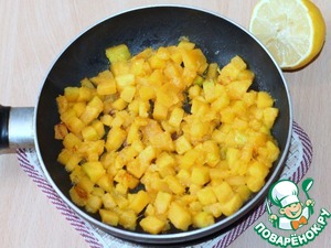 2. Разогреть 1 ст. л. сливочного масла и обжарить тыкву. Добавить 2 ч. л. сахара, 1 ст. л. сока лимона, перемешать и 1-2 минуты потомить на тихом огне.