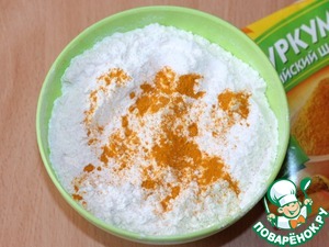 3. В миску просеять муку, добавить манную крупу, ванильный сахар, соль, разрыхлитель и немного шафрана.