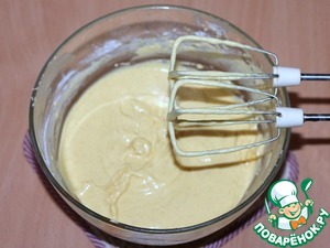4. Мягкое масло взбить с сахаром (1 ст. л.), с помощью миксера. Не переставая взбивать, ввести по одному яйца. Натереть на мелкой терке сыр и добавить к остальным продуктам, перемешать.