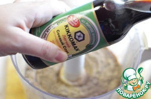Печень (можно теплую) выложить в блендер, посолить, поперчить добавить соевый соус "Киккоман", промолоть в однородное состояние.