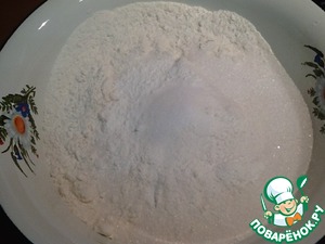 Тесто замешивается очень понятно и просто. Сначала просеем муку и добавим к ней все остальные сухие ингредиенты.