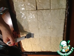 Через полчаса достаем, поправляет если необходимо, разрезаем на квадраты и смазываем яйцом взбитым с парой ложек сливок. -