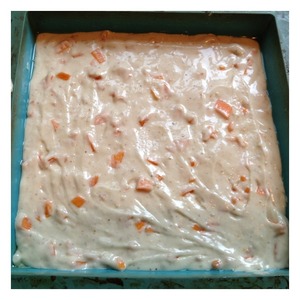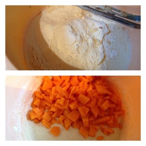 • Всыпать муку и разрыхлитель, слегка взбить. Тыкву очистить и нарезать маленькими кубиками. Добавить к тесту и аккуратно перемешать лопаткой.