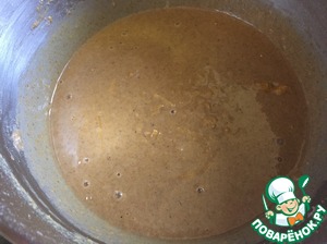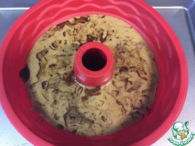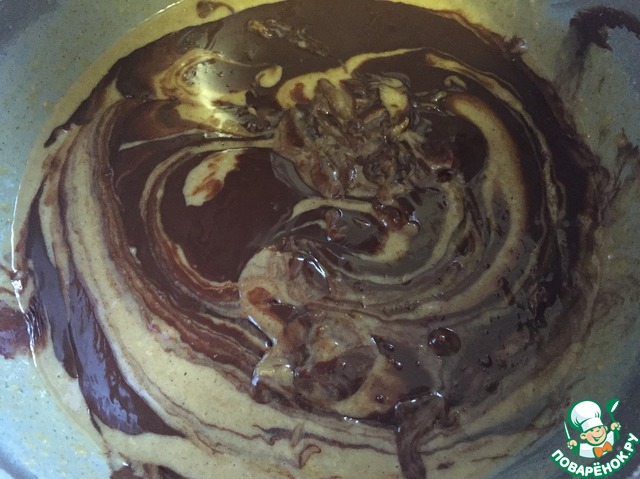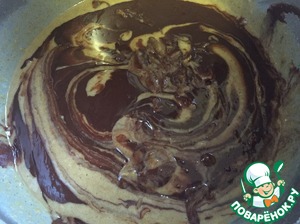 Растопленный шоколад выливаем сверху приготовленного теста и слегка вмешиваем. Шоколад не должен полностью вмешиваться.