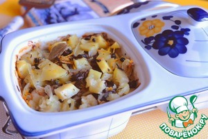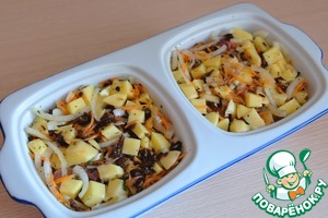 Далее вновь слой овощей. Таким образом заполнить формы до верха. Добавить жидкость (воду или мясной бульон). Форму поместить в духовой шкаф, запекать до готовности. Температура запекания около 200С.