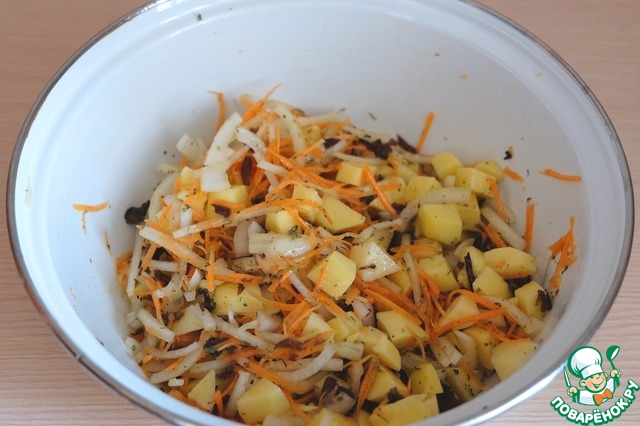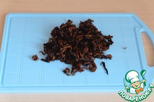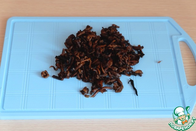 Сушеные опята промыть, залить холодной водой и припустить в течение 10-15 мин. Затем мелко порубить.
