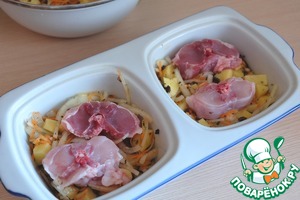 Далее слой картофеля, овощей и специй. Затем вновь слой мяса кролика.