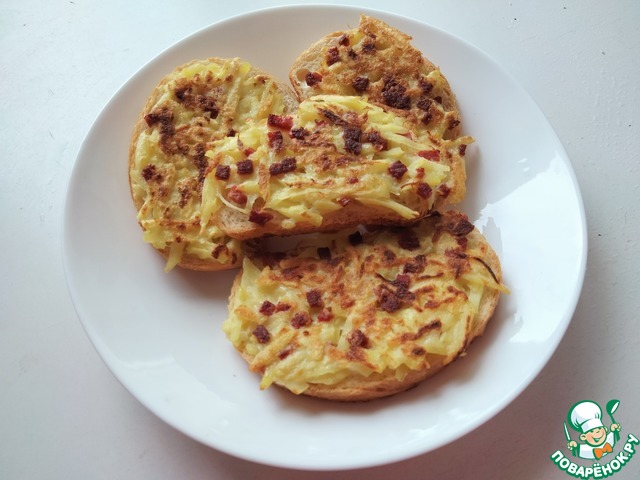 Наложите массу вилкой на кусочки батона и быстренько переверните на разогретую с маслом сковороду. (первый может получится комом, а потом присноровитесь). Накройте крышкой на 1.5-2 мин. Затем, открыв, зажарьте до золотистости картофеля. Переверните и поджарьте с другой стороны 30 сек.