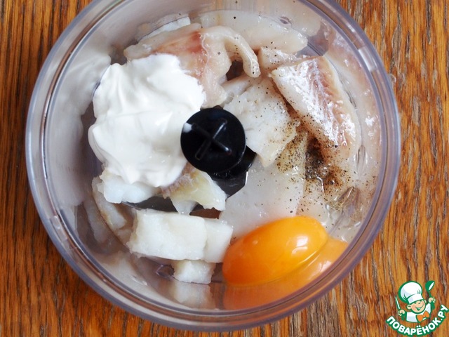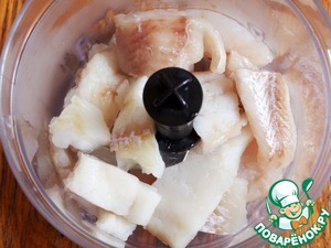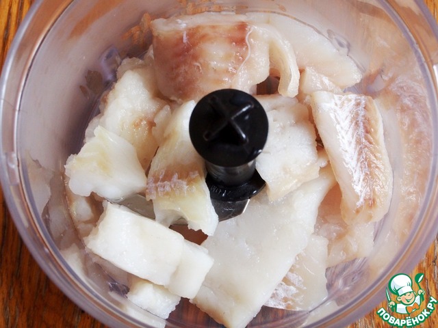 Филе минтая промыть, обсушить, порезать на кусочки и поместить в блендер. -