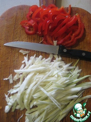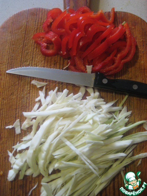 Болгарский перец нарезать соломкой, капусту нашинковать.