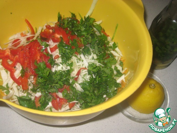 В миске соединить все овощи, добавить мелко нарезанную кинзу и петрушку. Влить лимонный сок и ароматное масло, добавить соль и смесь перцев по вкусу, хорошо перемешать.